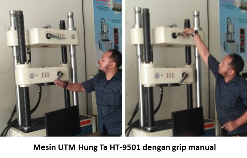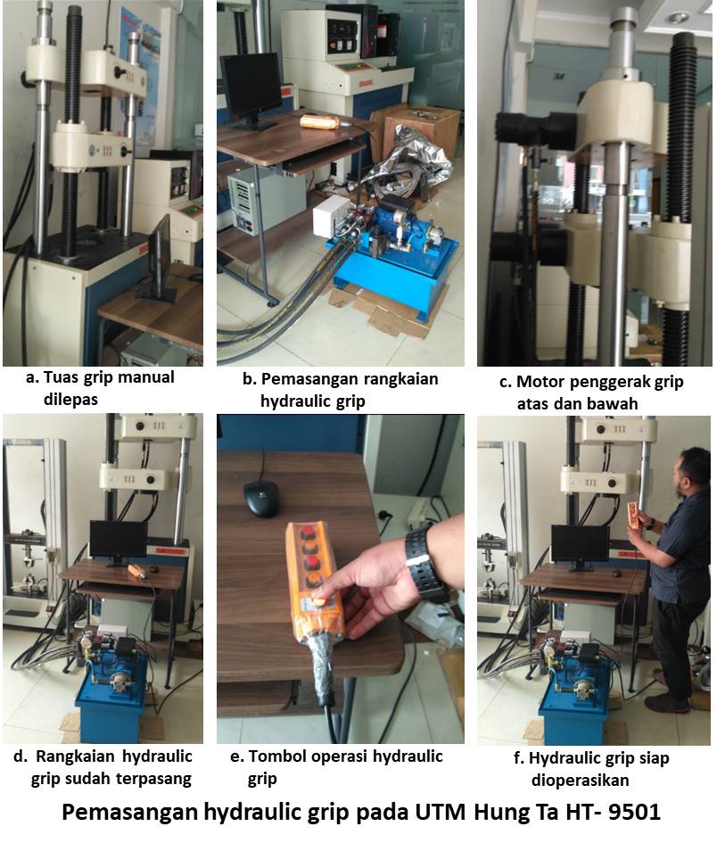 Mengacu terhadap persyaratan ini terutama pada grip maka mesin uji tarik yang masih menggunakan tuas manual pada penjepitnya seperti merek Hung Ta type HT-9501 tentunya tidak dapat memenuhi persyaratan SNI 8389-2017 lagi. Sebagai langkah antisipasi dan agar dapat memenuhi standar SNI 8389-2017, maka alat uji tarik UTM HT-9501 harus di-upgrade dengan pemasangan alat bantu yaitu Hydraulic Grip. Alat bantu ini dapat menggantikan fungsi tuas manual menjadi semi otomatis secara hidrolis dengan penggunaan tombol tekan. Tombol tekan ini akan mengendalikan grip penjepit bagian atas dan bawah dalam mencengkeram dan melepaskan jepitan pada benda uji dengan beban jepit yang lebih kuat dan terukur bila dibandingkan menggunakan tenaga manusia (operator). Resiko terlepasnya jepitan karena penggunaan tuas manual pada saat berlangsungnya pengujian beban tarik dapat dihindari.