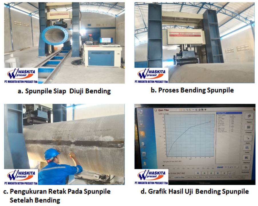 Gambar 1 di bawah memperlihatkan proses pengujian spunpile yang dimulai dari persiapan sampel uji, pengoperasian alat, pengamatan keretakan oleh pihak ketiga saat beban lengkung diberikan lalu proses pencatatan dan pelaporan.